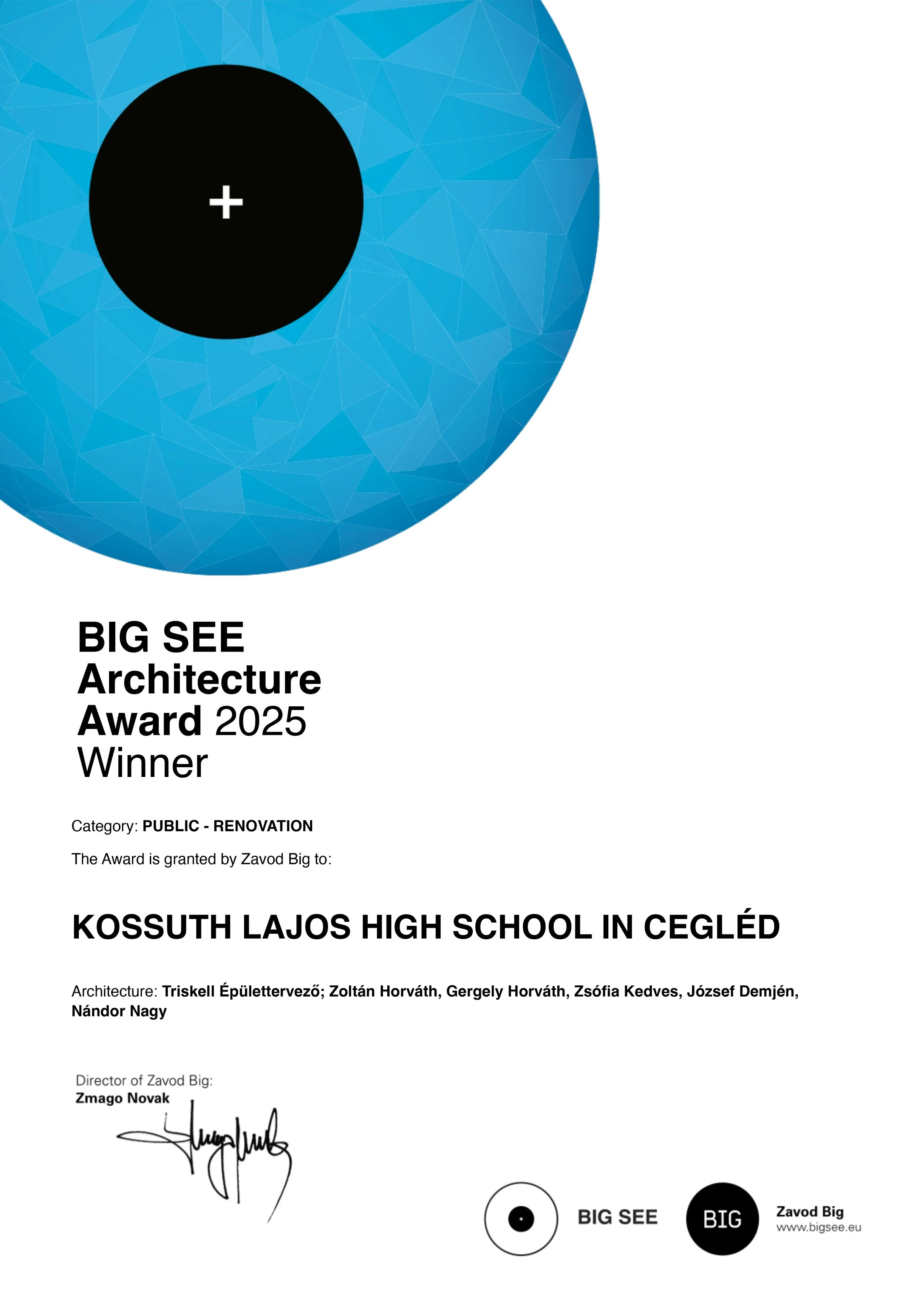 2022 | Cegléd Kossuth Gimnázium felújítása kiviteli tervek (építészet: Horváth Zoltán, Horváth Gergely) - BigSee Díj 2025